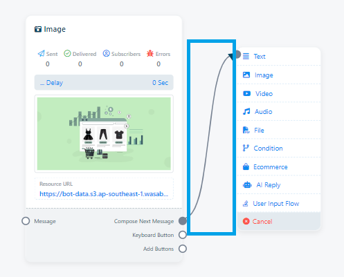 - Drag a connector from the `Start Bot flow` socket and leave the cursor to get component list. Select a desired component as required.