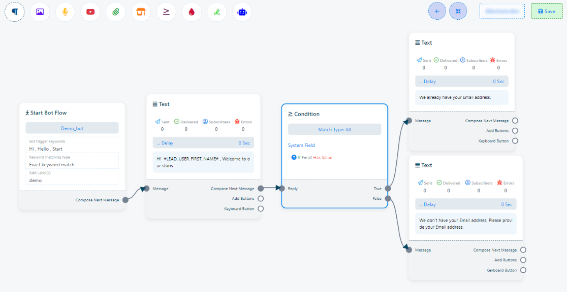 - If the condition evaluates to false, you can connect a User Input Flow message to the Text element connected to the `False` socket. This User Input Flow message will request the user to provide their email address, which can then be saved to the system or a custom field variable as needed.